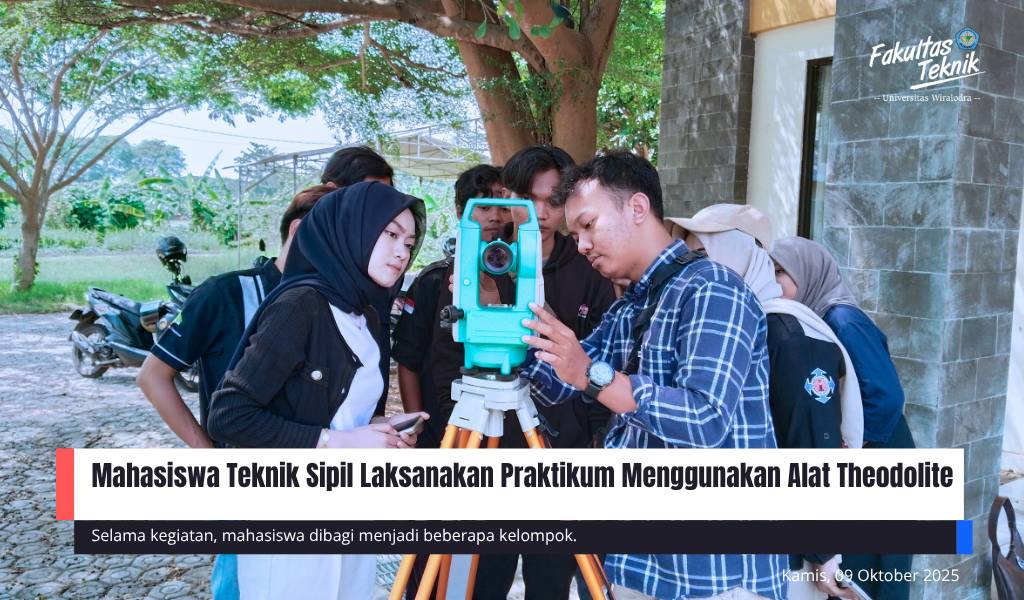 Mahasiswa Program Studi Teknik Sipil melaksanakan kegiatan praktikum Pengukuran Tanah menggunakan alat Theodolite pada hari Kamis, 9 Oktober 2025. Kegiatan ini berlangsung di area lapangan kampus dan diikuti oleh seluruh mahasiswa semester tiga yang mengambil mata kuliah Survey dan Pemetaan.