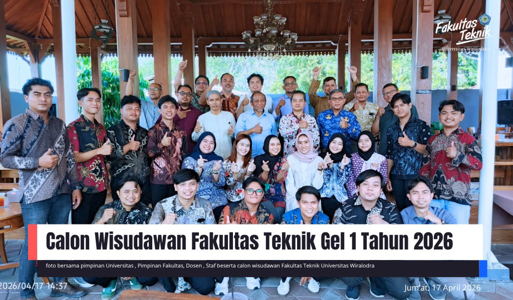 Indramayu – Fakultas Teknik Universitas Wiralodra melaksanakan kegiatan pelepasan calon wisudawan untuk Wisuda Gelombang I Tahun 2026 pada hari Jum’at, 17 April 2026. Acara ini berlangsung dengan penuh khidmat dan menjadi momen penting bagi para mahasiswa yang telah menyelesaikan masa studinya.