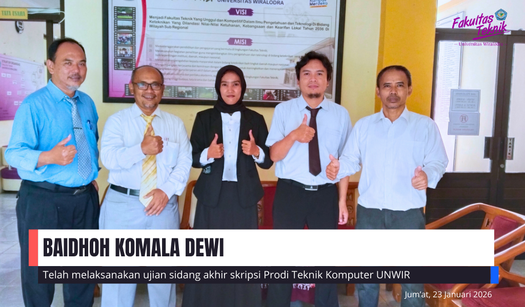 Fakultas Teknik Unwir melaksanakan sidang Skripsi Mahasiswa Program Studi Teknik Komputer an. Baidhoh Komala Dewi. Jum’at (23/01/2026).